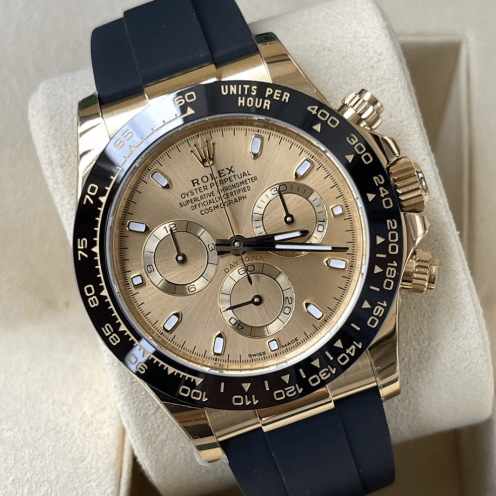 롤렉스 데이토나 크로노그래프 골드 다이얼 바인덱스 YG 금통 러버밴드 40mm 116518