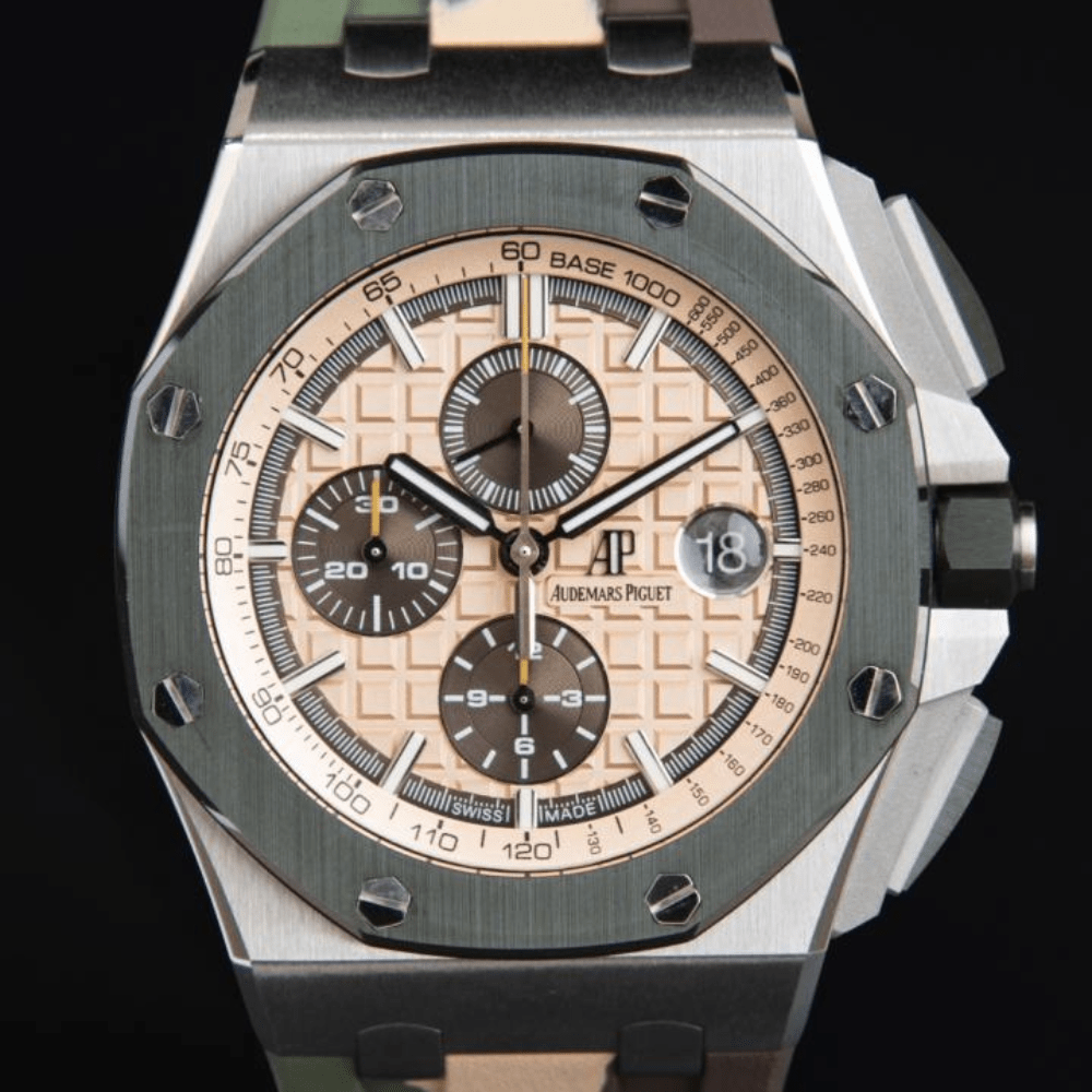 오데마피게 로얄오크 오프쇼어 크로노그래프 크림 다이얼 그린 세라믹베젤 카모 러버스트랩 44mm 26400SO