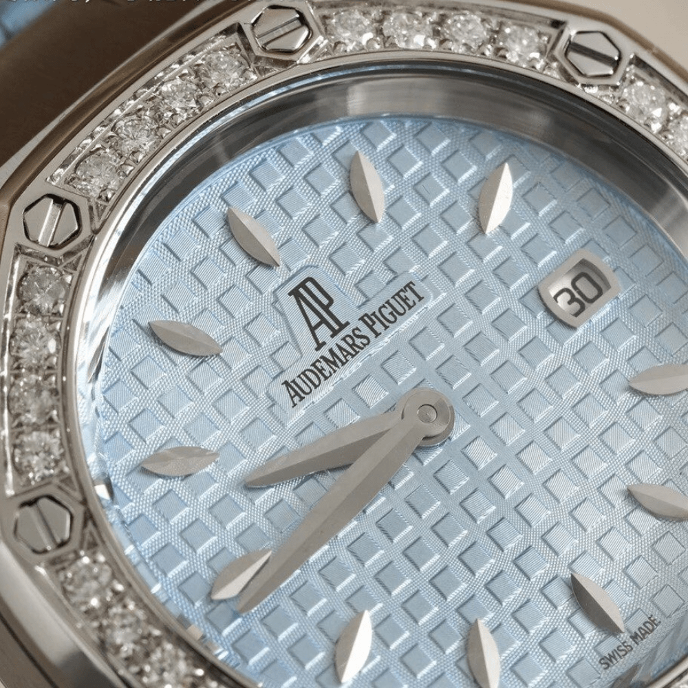 오데마피게 레이디 로얄오크 블루 텍스처 다이얼 다이아베젤 악어가죽 스트랩 33mm 67601ST