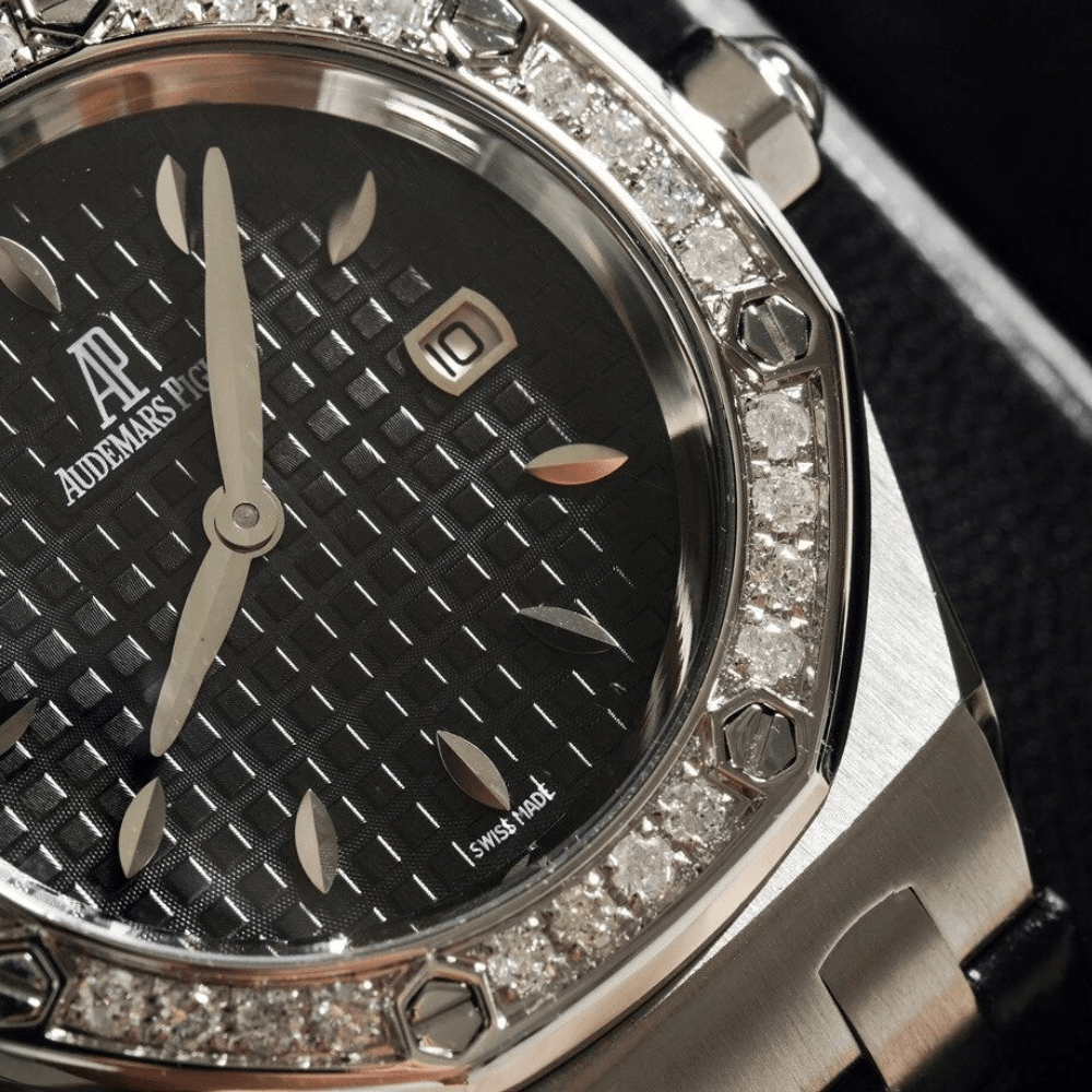오데마피게 레이디 로얄오크 블랙 텍스처 다이얼 다이아베젤 악어가죽 스트랩 33mm 67601ST