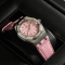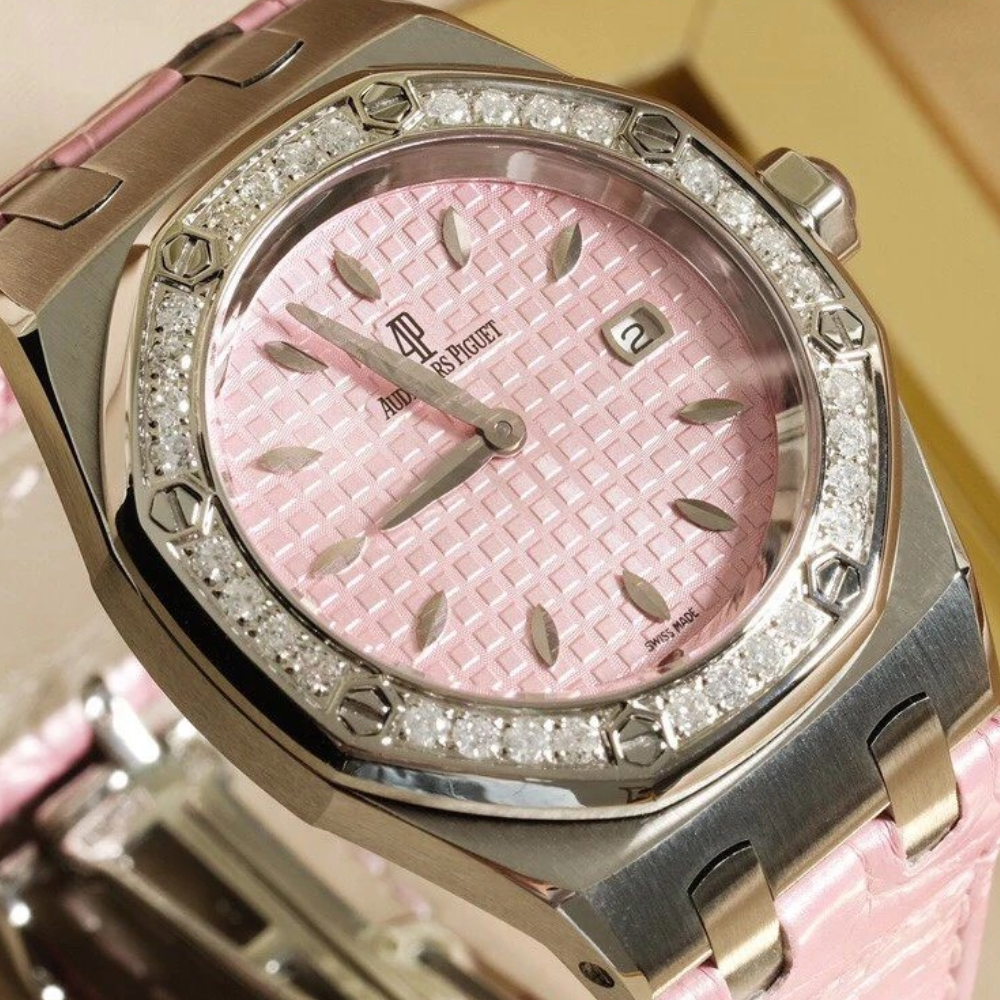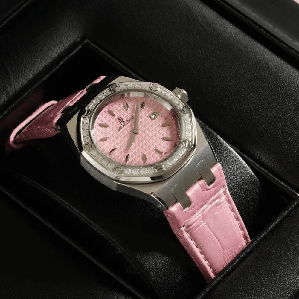 오데마피게 레이디 로얄오크 핑크 텍스처 다이얼 다이아베젤 악어가죽 스트랩 33mm 67601ST