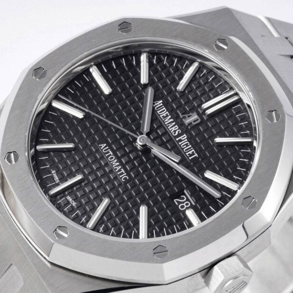 다이얼: 정품과 동일한 광택 처리된 르호의 슈퍼루미네이팅 블랙 텍스처 다이얼. 스위스 핸드셋. (ZF는 다이얼 색상과 일치하는 4가지 색상의 15400 정품 시계를 모두 보유하고 있습니다.)