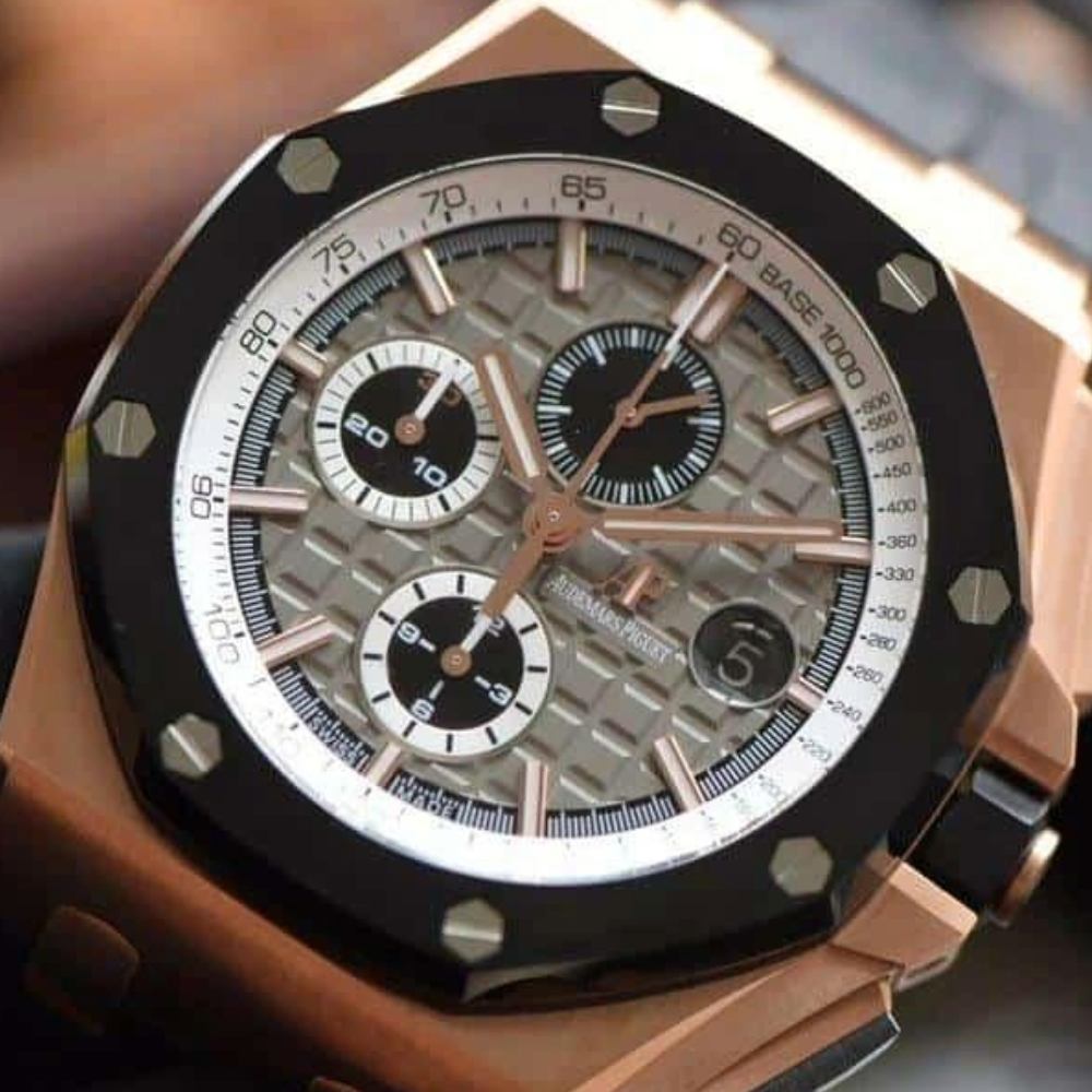 JF 2020 마스터피스 A.P 로얄 오크 오프쇼어 26416RO 크로노그래프 시리즈는 12H 7750 크로노그래프 무브먼트를 탑재했으며, 직경 44mm입니다. 로즈 골드 케이스, 세라믹 베젤! A.P 로얄 오크 시리즈 중 가장 강력한 모델 [JF 제작]