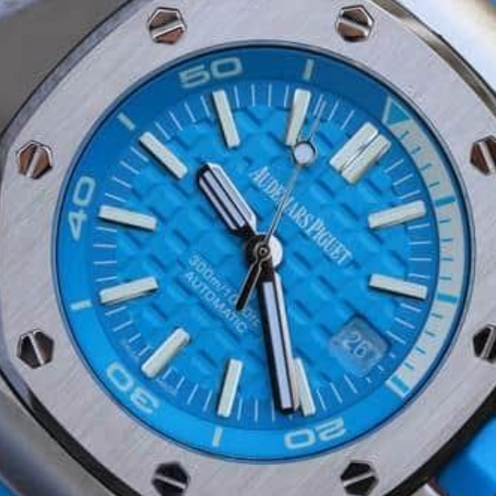 오데마 피게 V8 로얄 오크 15710ST, 2017년 새로운 여름 컬러 시리즈, 3120 복제 케이스 크기: 42mm. 케이스 두께: 14.1mm. "Méga Tapisserie" 오버사이즈 체크무늬 장식, 화이트 골드 형광 3차원 아워 마커 및 로얄 오크 핸즈, 다이빙 스케일이 있는 블루 회전 베젤, 옐로우 0~15분 표시 영역, 무반사 사파이어 크리스털 미러 소재. 방수 수심: 300m
