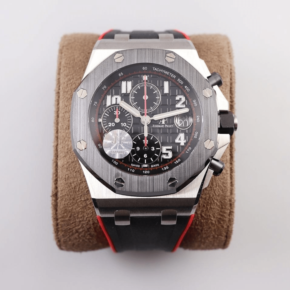 JF 오데마 피게 2018 시계. 직경 42mm! 세라믹 크라운, 세라믹 푸시 버튼, 맞춤형 12시간 크로노그래프 3126 무브먼트, 스페셜 블랙 및 레드 러버 스트랩.