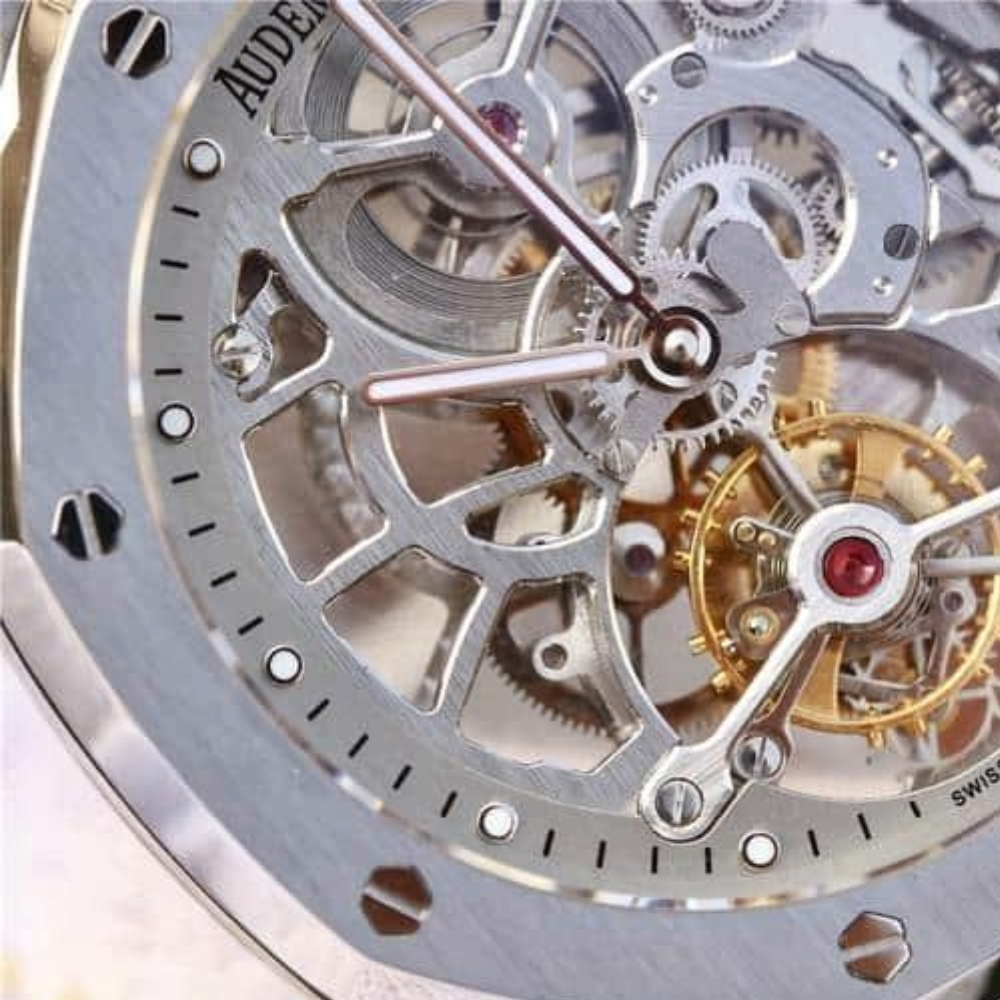 V2 업그레이드 로열 오크 26518 트루 투르비용 남성용 시계. 장인정신이 깃든 이 시계는 미세한 차이만으로도 무브먼트의 정확도나 충격 방지 효과에 영향을 미칠 수 있습니다. 2924 데이트 80 데이트 케이스 직경 41mm, 12.4mm. 1930년대, 오데마 피게는 이미 정교한 중공 장식 기술을 습득했으며, 오늘날까지도 전통적인 장인정신을 고수하고 있습니다. 줄질, 장식, 그리고 최종 장식 연마를 통해 오데마 피게는 정교한 중공 장식 기술을 완성해 왔습니다.