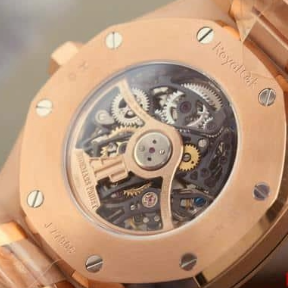 다이얼 소재: 속이 빈 다이얼, 로즈 골드 형광 3차원 아워 마커 및 로얄 오크 핸즈