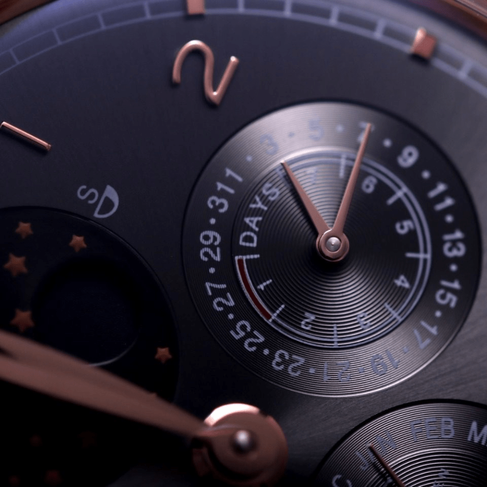 2. [해, 달, 별] - 날짜(3시), 월(6시), 주(9시)는 모두 정상적으로 작동하며 수동으로 조정할 수 있습니다(날짜는 2단 기어를 당겨 양방향으로 조정하고, 월은 8시 방향의 숨겨진 버튼으로 조정하며, 주는 포인터를 조정하여 구동할 수 있습니다)
