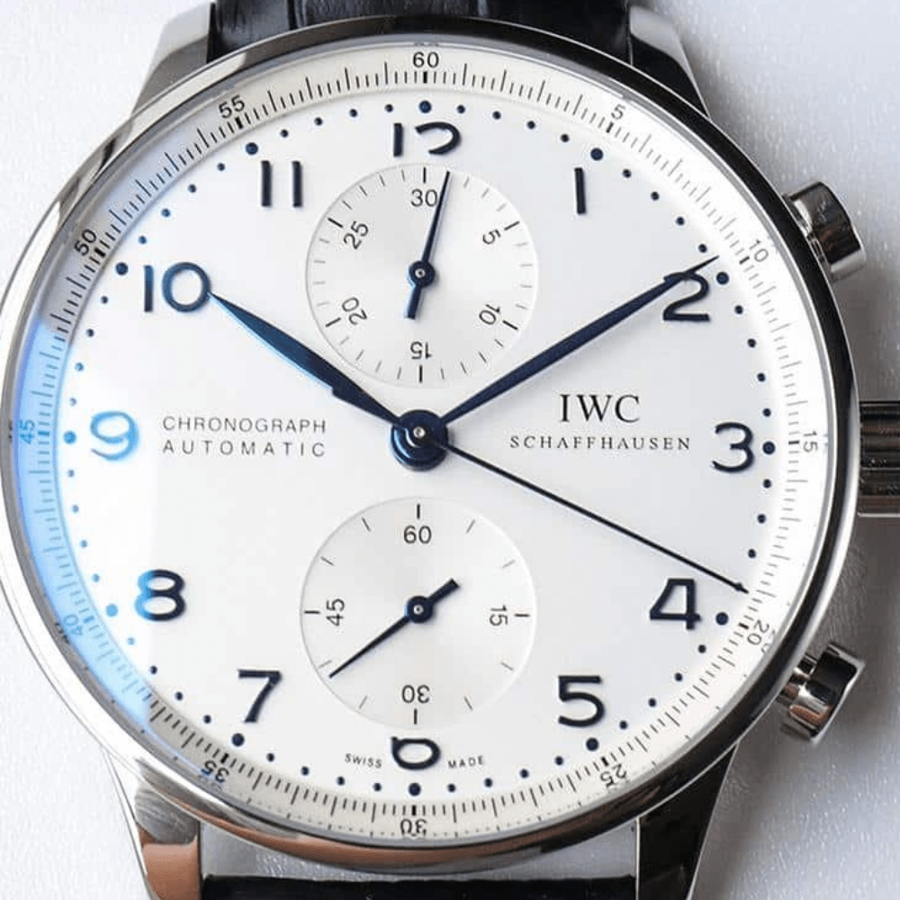 IWC 포르투기저 크로노그래프 블루 핸드 화이트골드 화이트 다이얼 레더 스트랩 41mm IW371446