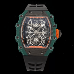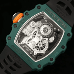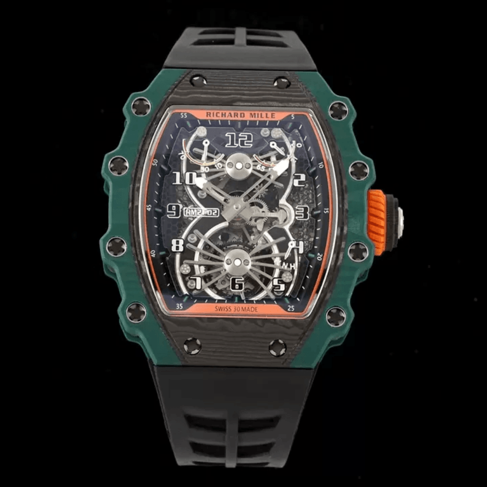 이 시계는 리차드 밀 케이스 중 가장 복잡한 작품 중 하나입니다. 베젤과 케이스 양쪽의 베젤 하단 커버는 그린 쿼츠 TPT 쿼츠 섬유로 제작되었습니다. 티타늄 합금 소재로 제작되어 다층적인 미래 감각을 보여줍니다.