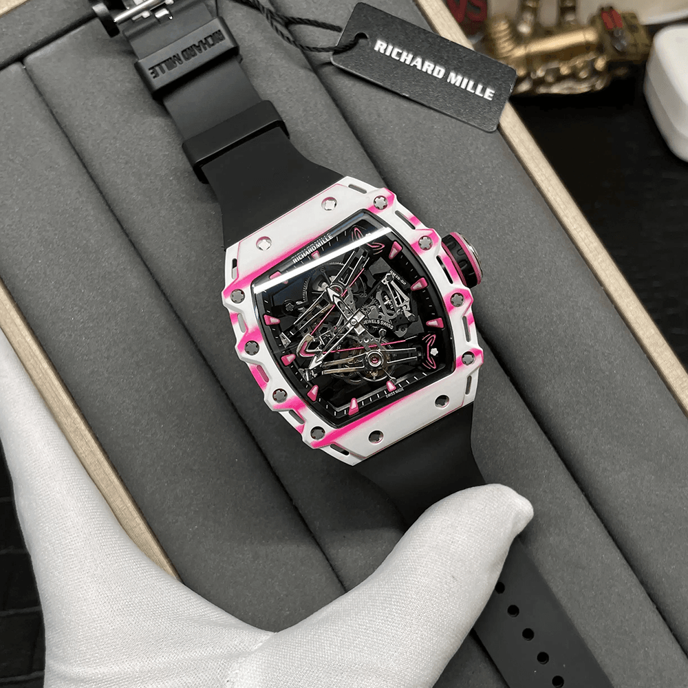 리처드 밀러 RM38-02 RM3802 RMF 베스트 에디션 화이트/핑크 카본 파이버 블랙 러버 스트랩 투르비용
