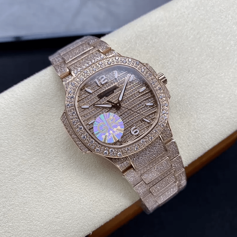 GR 고가의 클래식 시계 - 파텍 필립 7118 여성용 노틸러스. 다이아몬드가 가득 박힌 한정판 모델. 한정판 웨이트 제공. 한정판 웨이트 제공 (본체는 8개의 하트와 8개의 화살 모양이 있는 천연 오팔 라인스톤으로 제작되었습니다).