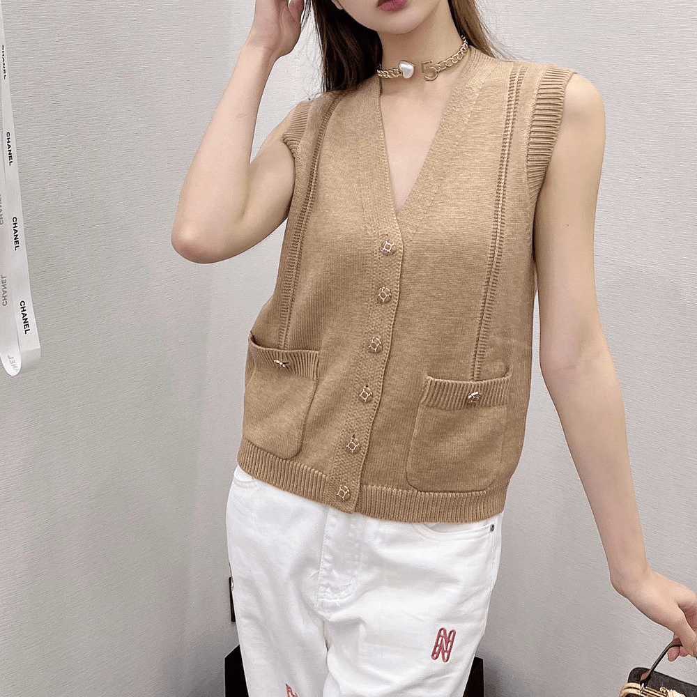 샤넬 24SS 클래식 더블 포켓 니트 조끼 브라운