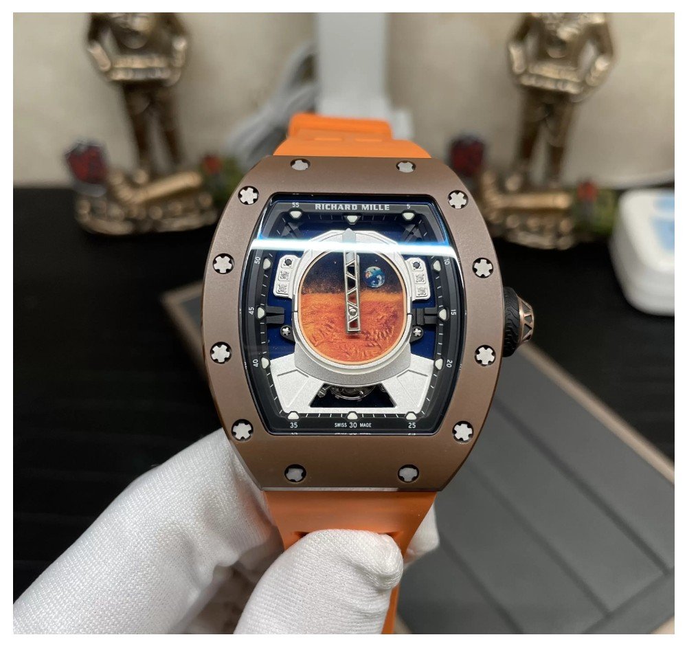 RM 52-05 투르비용 시계는 우주 비행사 헬멧과 우주 디자인의 완벽한 조화를 이룹니다. 우주 비행사 헬멧 양쪽에는 프로젝터와 카메라가 장착되어 있으며, 각 카메라에는 두 개의 다이아몬드와 블랙 커런덤이 상감되어 있습니다. 헬멧 앞면에는 명나라 시대의 불 에나멜로 장식된 가상의 불꽃별이 그려져 있습니다.